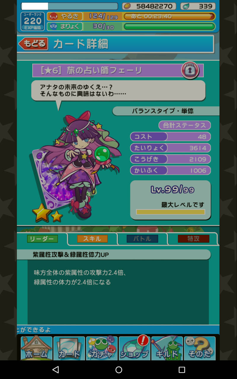 紫カードのステータスが攻撃力8.6倍、体力3.6倍、回復力1.2倍まで上昇しています。